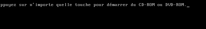 2) le programme d'installation devrait normalement ce lancer, via un message où il est demandé d'appuyer sur une touche pour lancer le DVD d'installation, appuyer donc sur une touche quelconque (voir image ci-dessous):